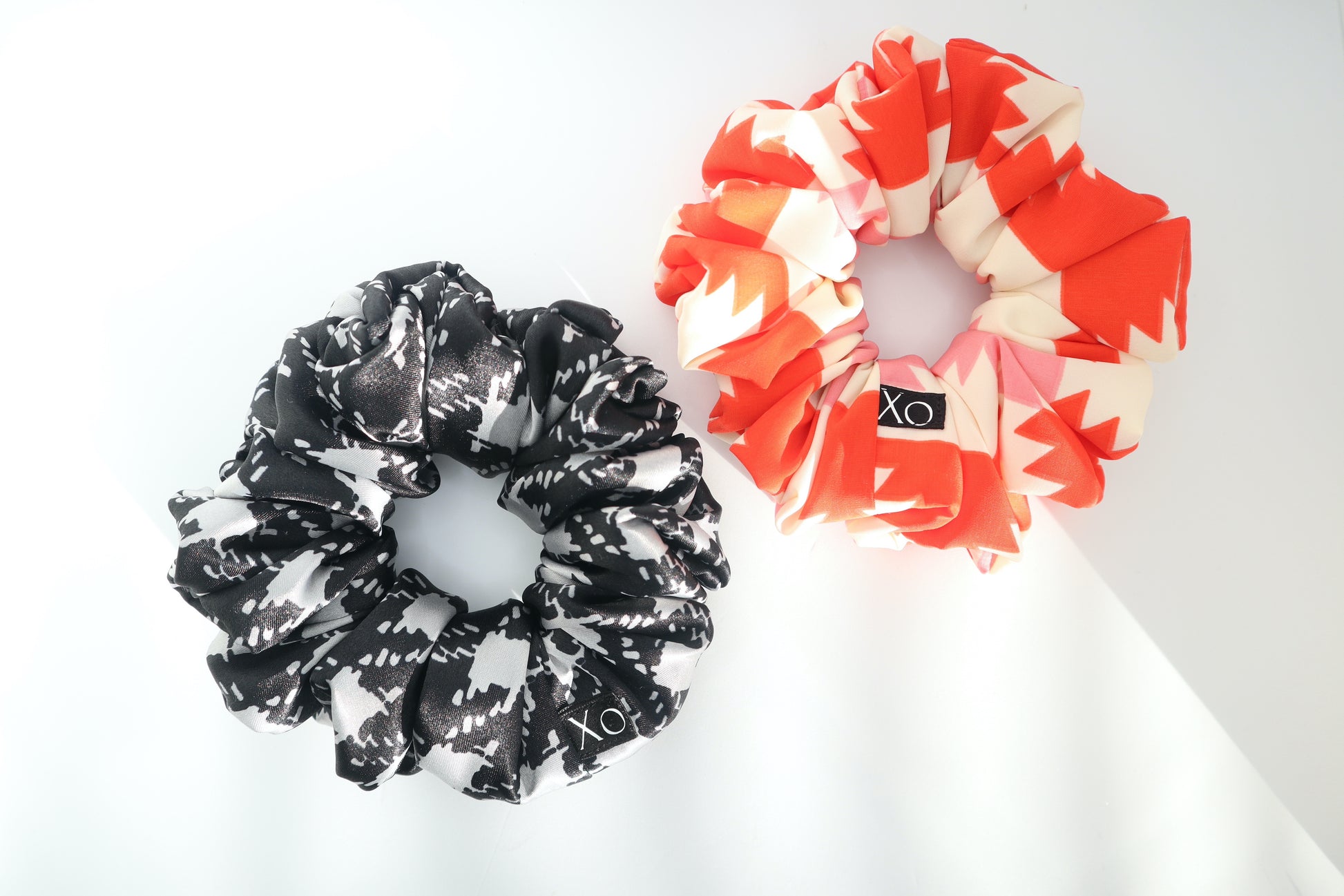 This XL tribal Aztec scrunchie wraps hair 2-3 times for bold style with ultra-soft peachskin. Elevate your holiday look with XO Scrunchies handcrafted flair!